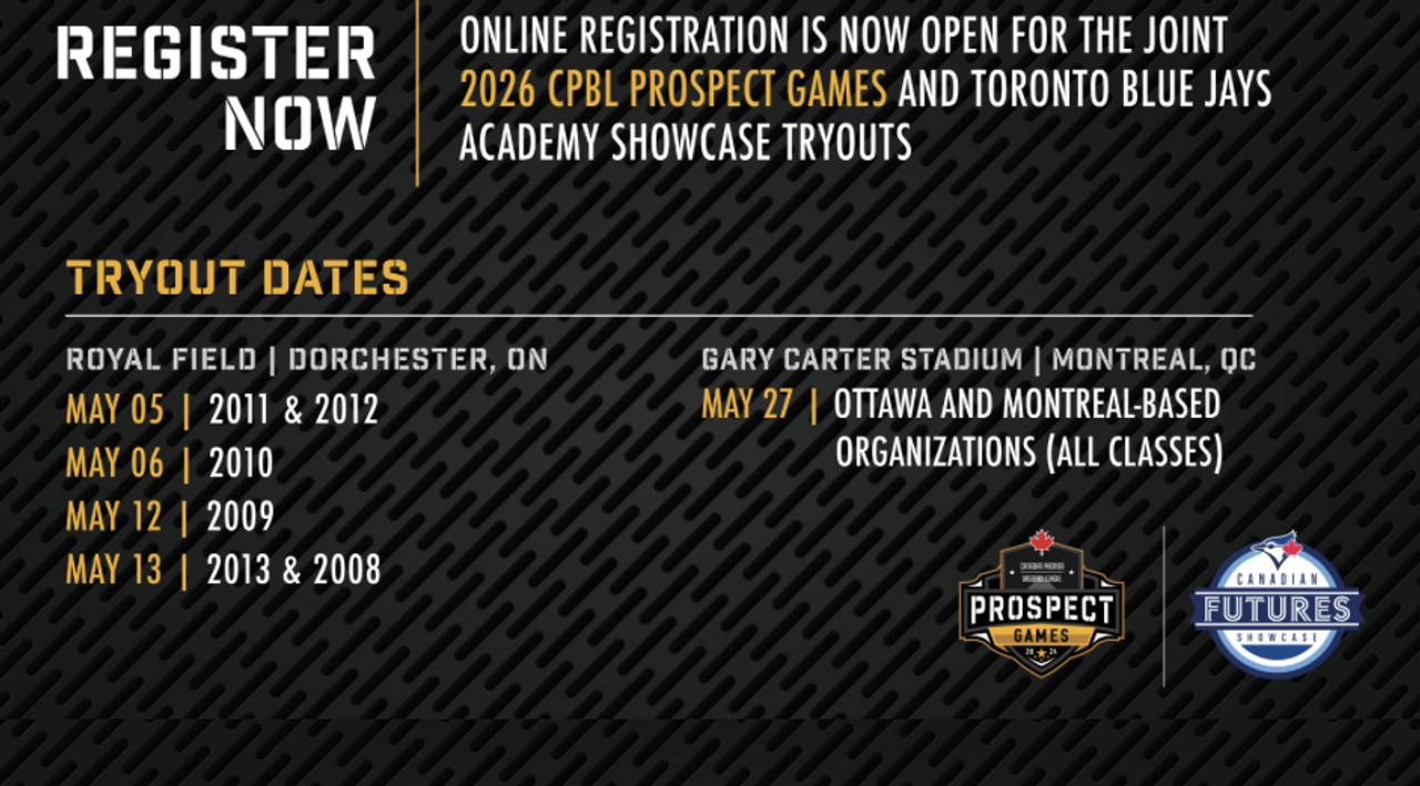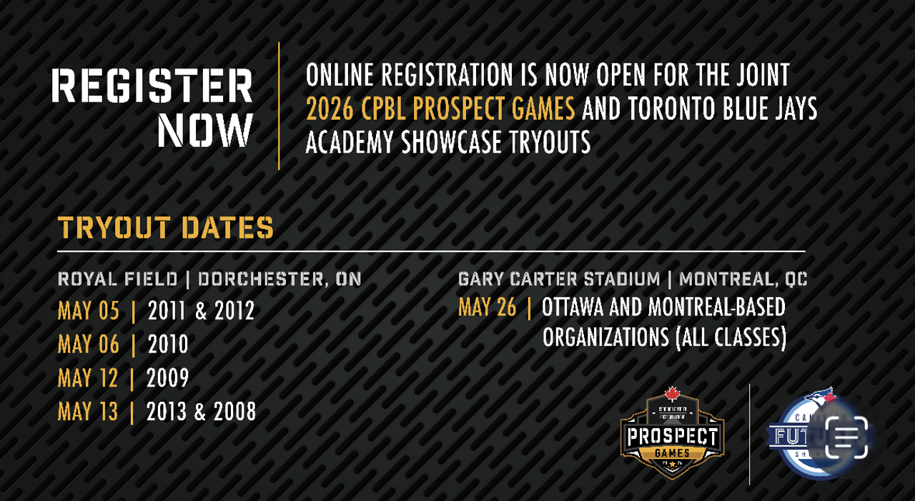 The Canadian Premier Baseball League is pleased to announce that 2026 will mark the third year of our continued partnership with the Toronto Blue Jays Academy. Beginning in 2024, this partnership set out to give CPBL players the opportunity to be evaluated for the two most prestigious amateur baseball events in the country, in one place at one time. This year, similar to years past, players will have the opportunity to try-out for the Toronto Blue Jays Baseball Academy Canadian Futures Showcase in addition to the CPBL Prospects Game, all in one workout. All players will be evaluated for the CPBL Prospects Game by a committee comprised of CPBL executives, MLB Scouts and CPBL Organizational Leaders, while the Toronto Blue Jays Scouting Department will be on hand to evaluate for their Futures Showcase. Players selected for either the CPBL Prospect Games or the Toronto Blue Jays Futures Showcase will have the opportunity to compete in front of the largest college recruiting and professional scouting events Canadian players are offered.